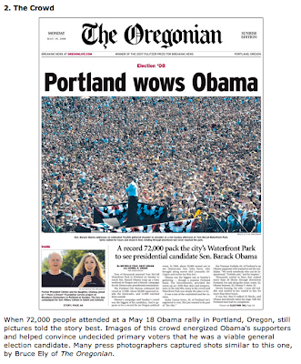 I think this really an interesting idea to pinpoint photos that made the biggest impact on Obama's campaign. Even more interesting, is that a photo in The Oregonian made the list...or more accurately images from Portland rally had the impact. I forget what I was doing during that rally, but I wasn't in town. Click the link above to see the entire list.